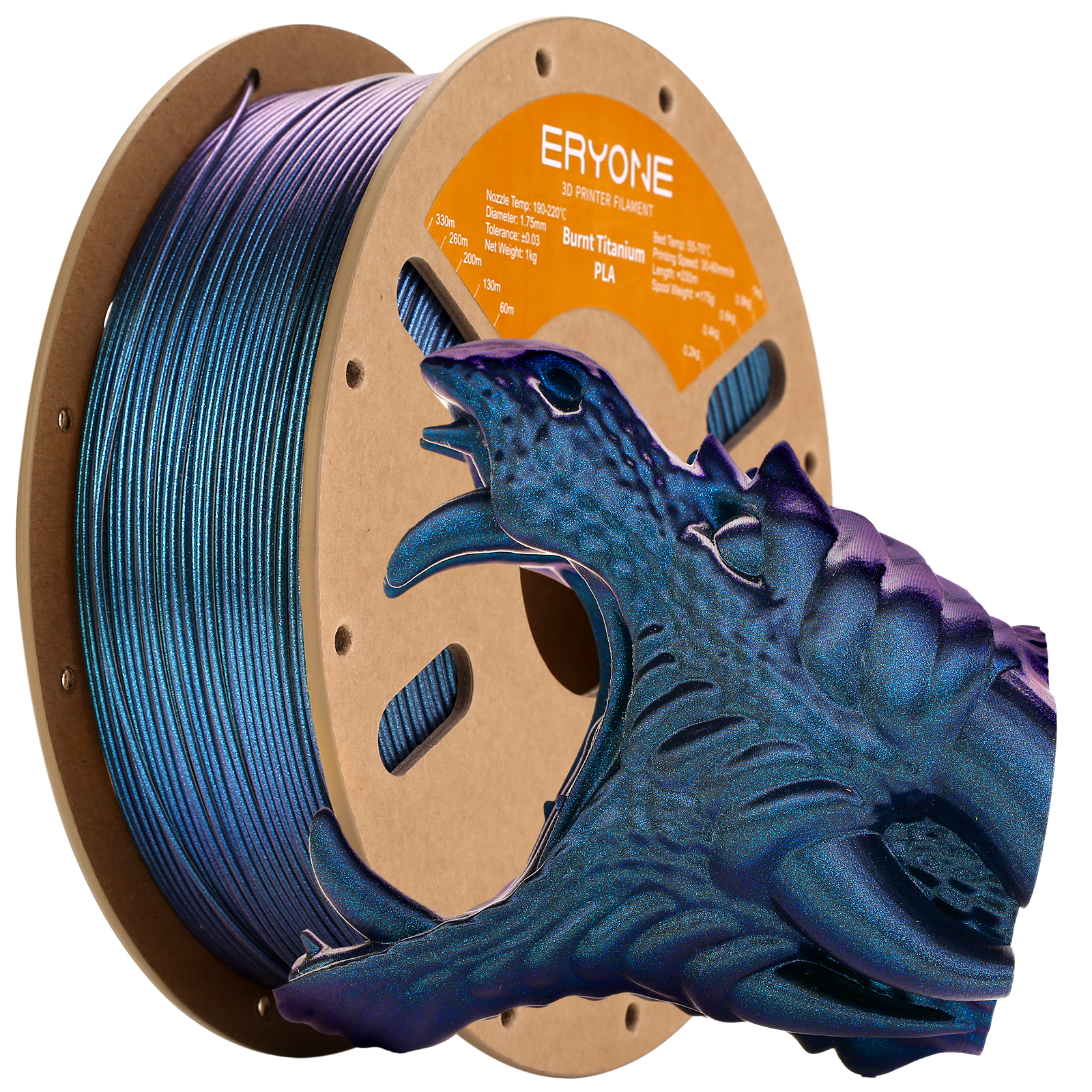 Eryone Burnt Titanium PLA — это декоративный PLA-филамент с эффектом металлического градиента, вдохновлённого цветами обожжённого титана. Плавные переходы синего, фиолетового и золотистого оттенков создают премиальный, «индустриальный» внешний вид без покраски и постобработки.